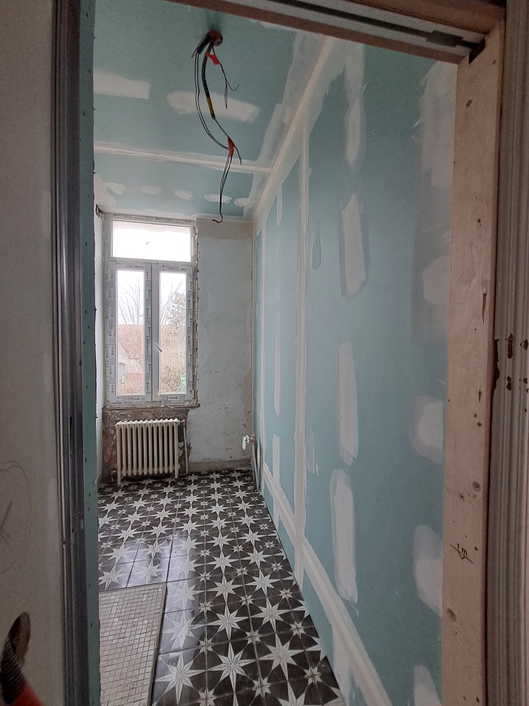 Réalisation d'une cloison et pose de plaques de plâtre dans une salle de bain et pose de calicots à Camiers.